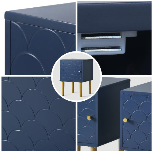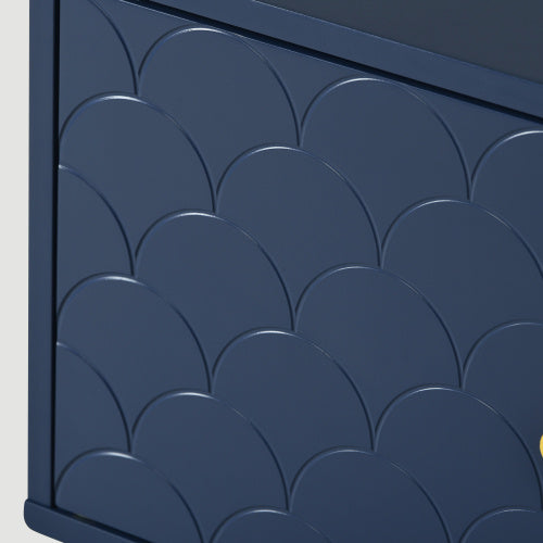- Einzigartige Platte mit Fischschuppenmuster: Das marineblaue Fischschuppenmuster und die champagnerfarbenen Metallbeine verleihen diesem Schrank eine elegante Präsenz im Schlaf- und Wohnzimmer.Das Produkt ist mit hochwertigen Metallscharnieren ausgestattet, die es ermöglichen,die Abstände zwischen den Türen und Schubladen zu regulieren, wodurch die Platten ein kohärentes und ästhetisch ansprechenderes Fischschuppenmuster erhalten.
